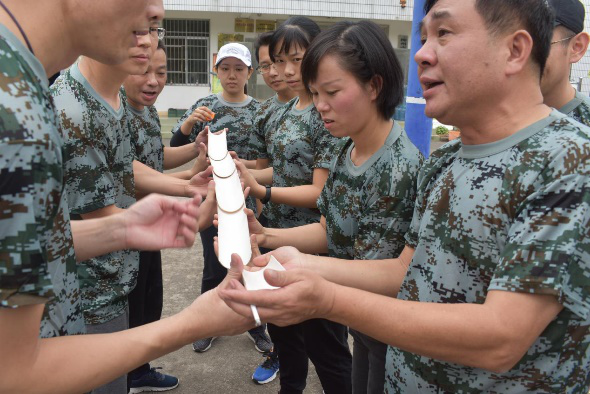 參訓(xùn)人員隨機(jī)分配為3支隊(duì)伍,經(jīng)過(guò)各小組的一番頭腦風(fēng)暴,“旗艦隊(duì)”、“全勝戰(zhàn)隊(duì)”、“陽(yáng)光隊(duì)”分別以其響亮的口號(hào)和別出心裁的隊(duì)形一一精彩亮相。在團(tuán)建活動(dòng)中,先后進(jìn)行了趣味破冰、挑戰(zhàn)150、水果連連看、決戰(zhàn)沙場(chǎng)和團(tuán)隊(duì)能量圈等多個(gè)項(xiàng)目,活動(dòng)中三支隊(duì)伍齊心協(xié)力,勇闖難關(guān),挑戰(zhàn)了一個(gè)又一個(gè)不可能?!叭の镀票笔箞F(tuán)隊(duì)感情迅速升溫,促進(jìn)了隊(duì)員們彼此之間的交流和信任;“挑戰(zhàn)150”讓隊(duì)員們明白了在遇到“時(shí)間緊任務(wù)重”的突發(fā)情況,團(tuán)隊(duì)如何分工和協(xié)作;“水果連連看”鍛煉了團(tuán)隊(duì)溝通和快速反應(yīng)能力,使隊(duì)員們學(xué)會(huì)如何高效合作;“決戰(zhàn)沙場(chǎng)”讓隊(duì)員們體驗(yàn)到了在企業(yè)中處于不同層級(jí)人員之間應(yīng)如何配合、有效傳遞信息和指令,以及執(zhí)行力對(duì)于完成任務(wù)的重要性。