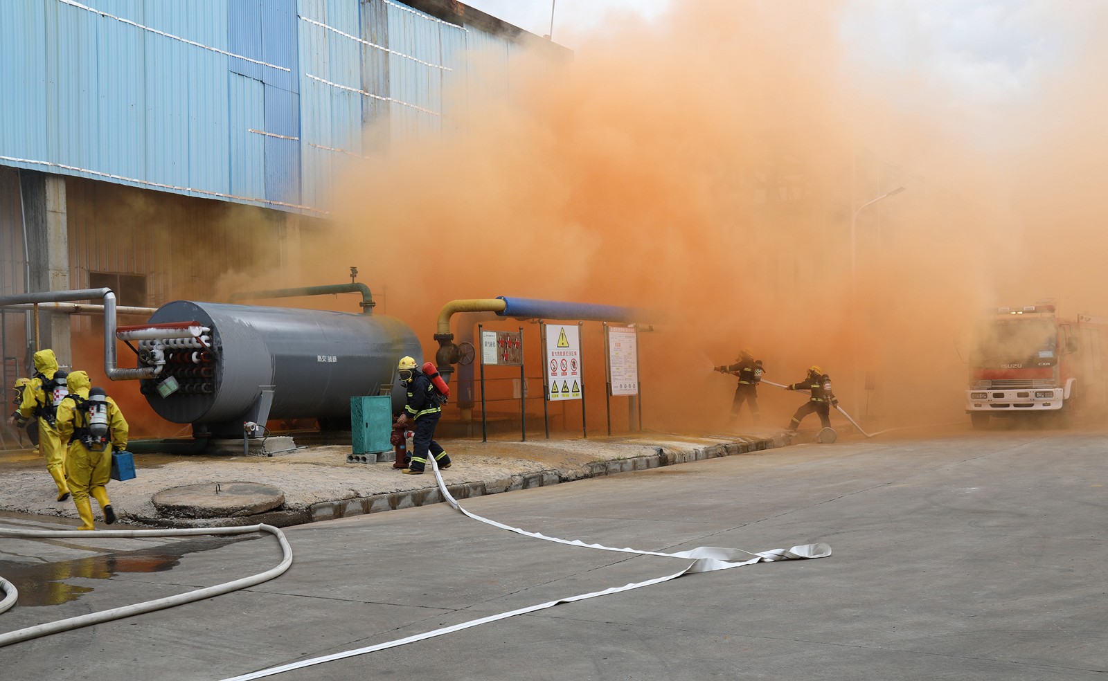 “報(bào)告班長(zhǎng),液氯充裝屏蔽泵區(qū)域有大量氯氣泄漏,情況不明?!薄皥?bào)告梁廠長(zhǎng),液氯充裝屏蔽泵區(qū)域附近有大量氯氣泄漏,情況不明?!薄笆盏?,立即啟動(dòng)氯氣泄漏事故應(yīng)急預(yù)案?!薄?月18日上午,市產(chǎn)業(yè)集團(tuán)公司2020年危險(xiǎn)化學(xué)品事故應(yīng)急救援演練活動(dòng)在市產(chǎn)業(yè)集團(tuán)廣西柳化氯堿有限公司生產(chǎn)區(qū)內(nèi)舉行,集團(tuán)公司黨委副書(shū)記、總經(jīng)理黃哲毅,副總經(jīng)理覃立基出席并指揮演練活動(dòng),集團(tuán)公司資產(chǎn)管理部工作人員及集團(tuán)公司所屬企業(yè)代表參加演練活動(dòng)。